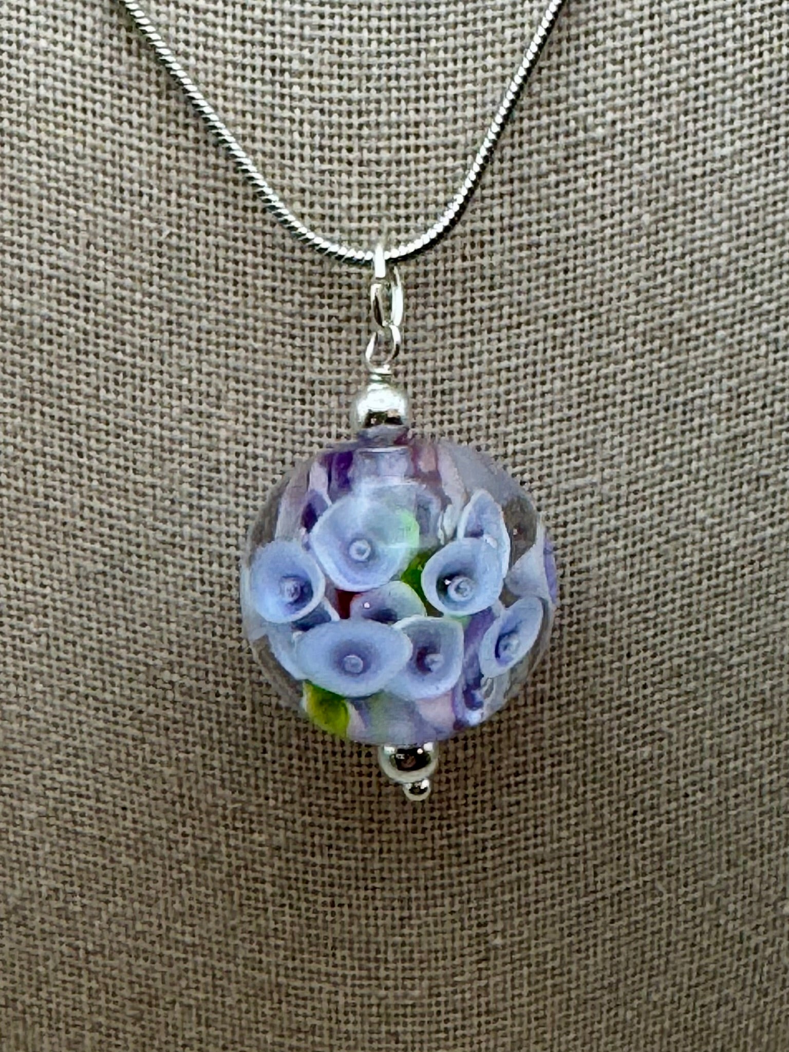 Layers of tiny lilac bellflowers embedded in glass, on a 20" stainless steel chain. Handmade bead is approximately 3/4 inch tall.