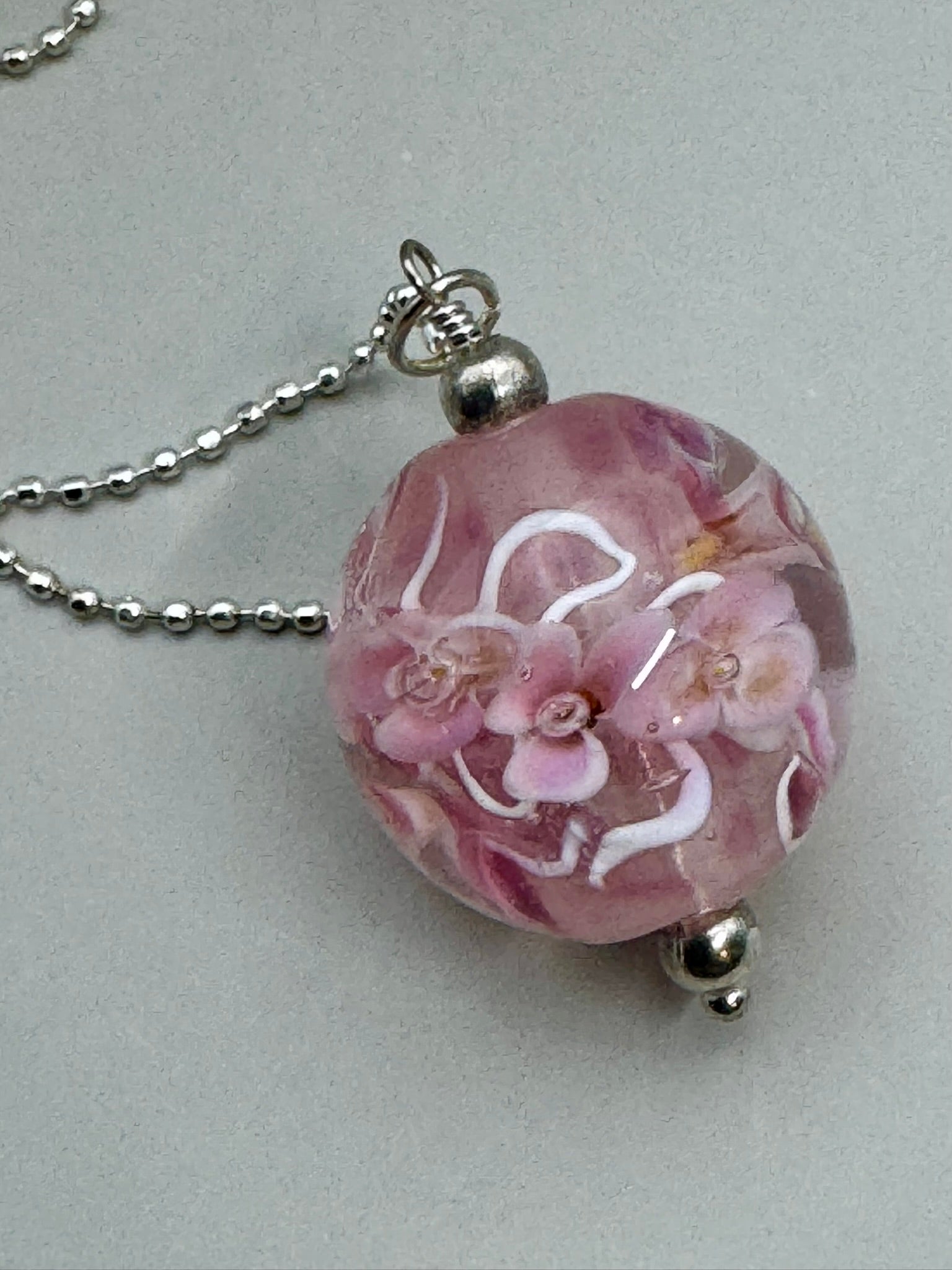 Why wait for spring? Handmade glass bead with layers of rosy blooms. Bead is approximately 1" in diameter - set on an 18" silver-plated bead chain.